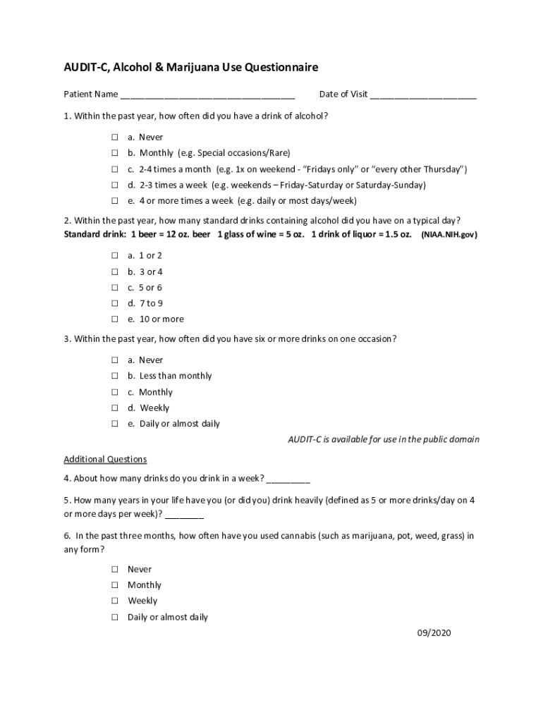 AUDIT, Alcohol & Marijuana Use Questionnaire Patient Name ___Date of Visit ___1. Within the past year, how often did you have a drink of alcohol? a. Never. 24 times a month (e.g. 1x on weekend Fridays