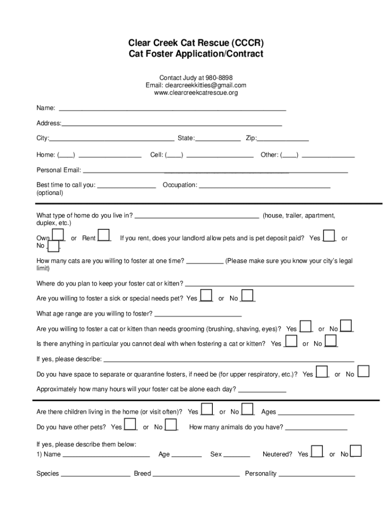 Clear Creek Cat Rescue (CCCR) Cat Foster Application/Contract Contact Judy at 9808898 Email: clearcreekkitties@gmail.com www.clearcreekcatrescue.org Name: Address: City: Home: (State:)Cell: (Zip:)Other: