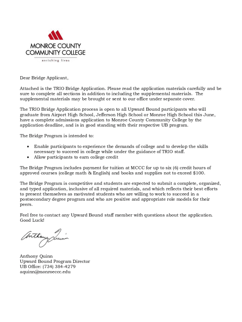 Dear Bridge Applicant, Attached is the TRIO Bridge Application. Please read the application materials carefully and be sure to complete all sections in addition to including the supplemental materials.