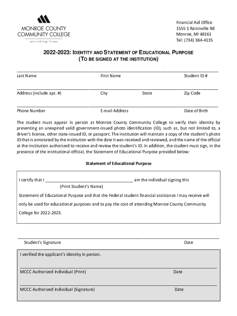 Financial Aid Office 1555 S Watsonville Rd Monroe, MI 48161 Tel: (734) 384413520222023: IDENTITY AND STATEMENT OF EDUCATIONAL PURPOSE (TO BE SIGNED AT THE INSTITUTION) ___Last NameFirst NameStudent