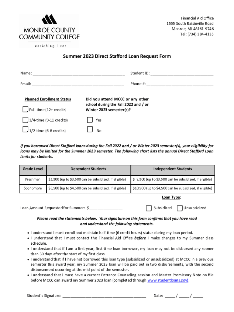 Financial Aid Office 1555 South Watsonville Road Monroe, MI 481619746 Tel: (734) 3844135Summer 2023 Direct Stafford Loan Request Form Name: ___Student ID: ___Email: ___Phone #: ___Planned Enrollment