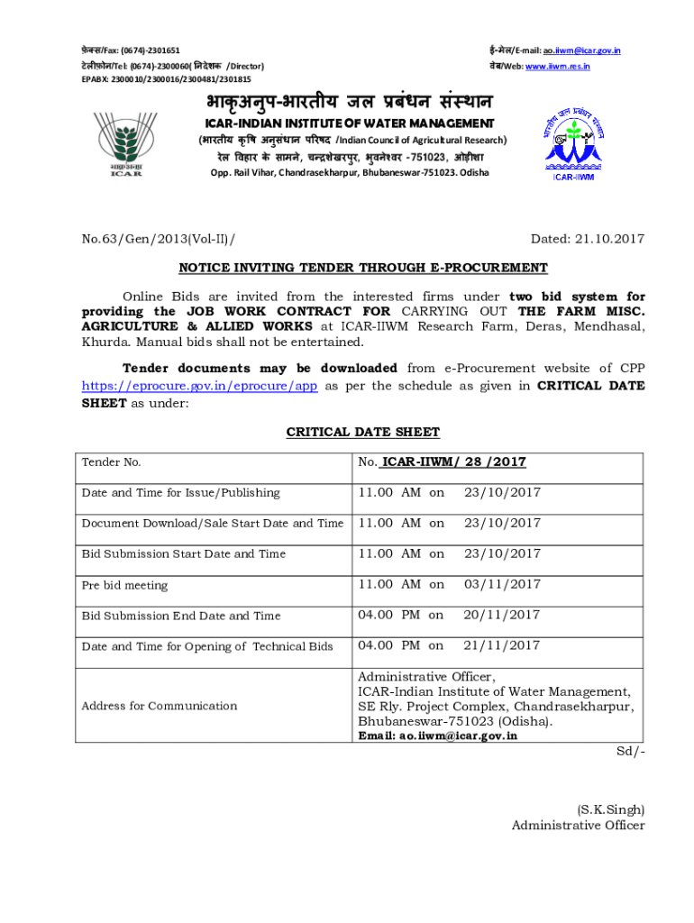/Fax: (0674)2301651/Email: ao.iiwm@icar.gov.in /Tel: (0674)2300060(/Director) PBX: 2300010/2300016/2300481/2301815/Web: www.iiwm.res.in AMERINDIAN INSTITUTE OF WATER MANAGEMENT(/Indian Council of