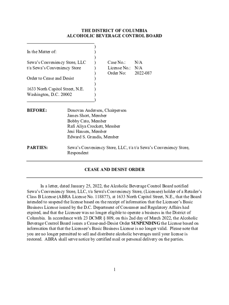 THE DISTRICT OF COLUMBIA ALCOHOLIC BEVERAGE CONTROL BOARD ___) In the Matter of:)) Seas Convenience Store, LLC) Case No.: N/A t/a Seas Convenience Store) License No.: N/A) Order No: 2022087 Order
