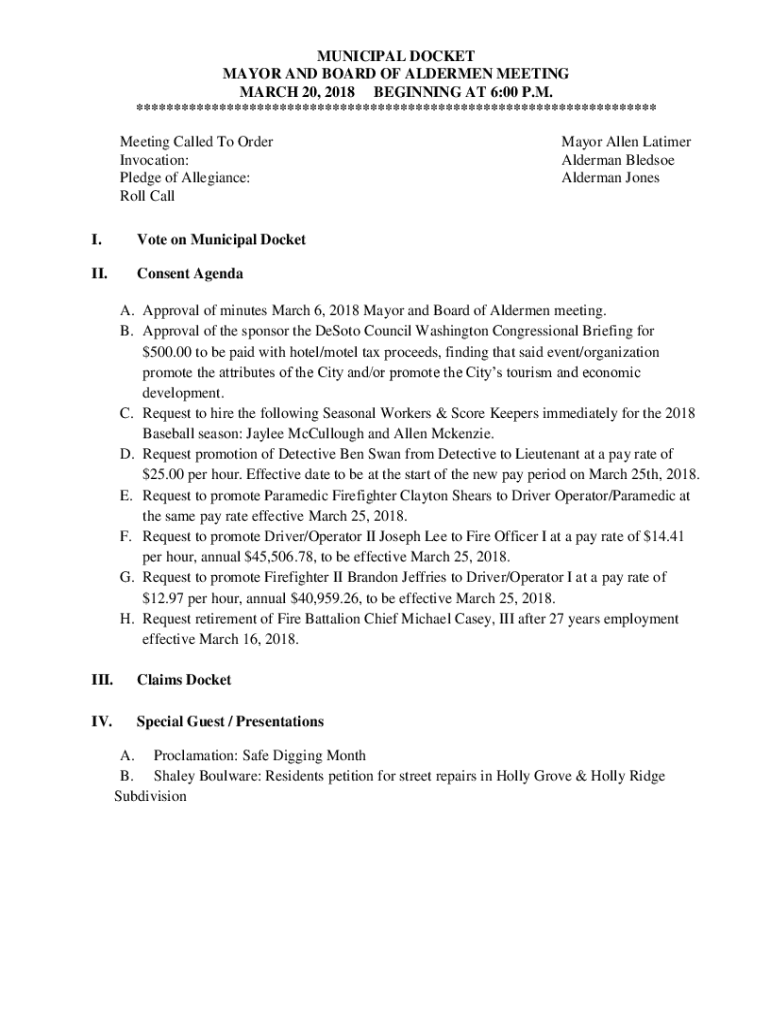 MUNICIPAL DOCKET MAYOR AND BOARD OF ALDERMEN MEETING MARCH 20, 2018, BEGINNING AT 6:00 P.M. ********************************************************************* Meeting Called To Order Invocation:
