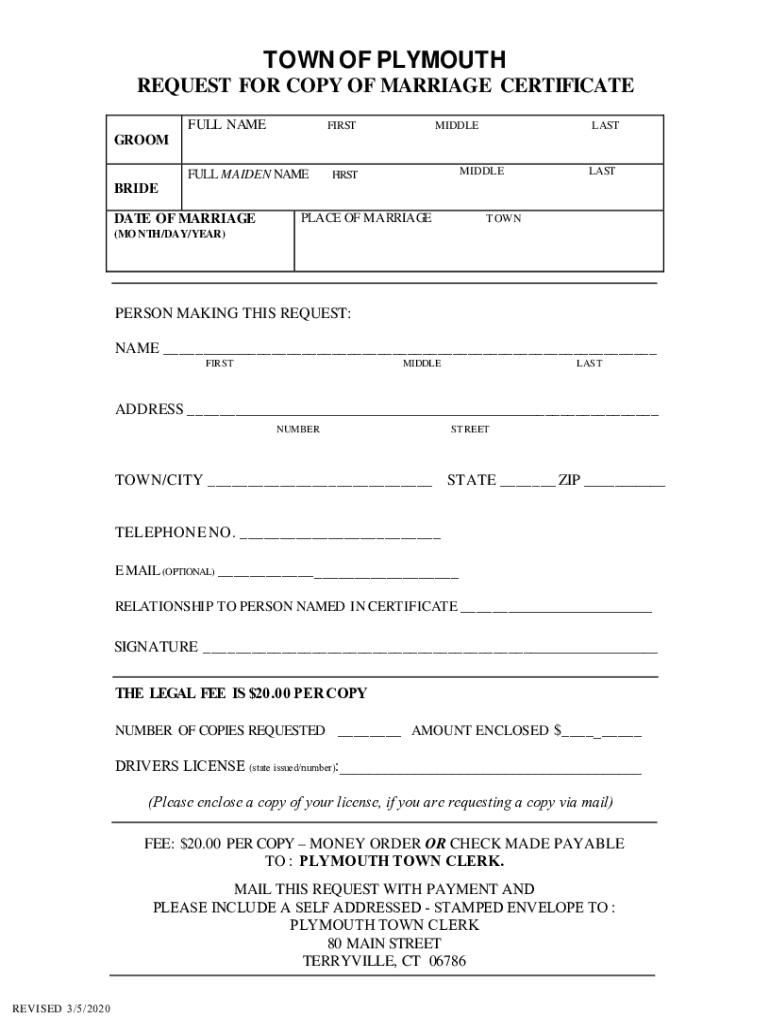 TOWN OF PLYMOUTH REQUEST FOR COPY OF MARRIAGE CERTIFICATE FULL NAMEFIRSTMIDDLELASTGROOM FULL MAIDEN NAMEMIDDLEFIRSTLASTBRIDE DATE OF MARRIAGEPLACE OF MARRIAGE TOWN(MO NTH/DAY/YEAR)PERSON MAKING THIS