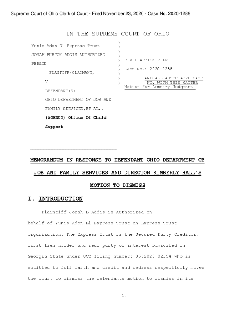 Supreme Court of Ohio Clerk of Court Filed November 23, 2020, Case No. 20201288IN THE SUPREME COURT OF OHIO Tunis Avon El Express Trust JONAH BURTON ADDS AUTHORIZED PERSON PLAINTIFF/CLAIMANT, V DEFENDANT(S)))))))))))CIVIL