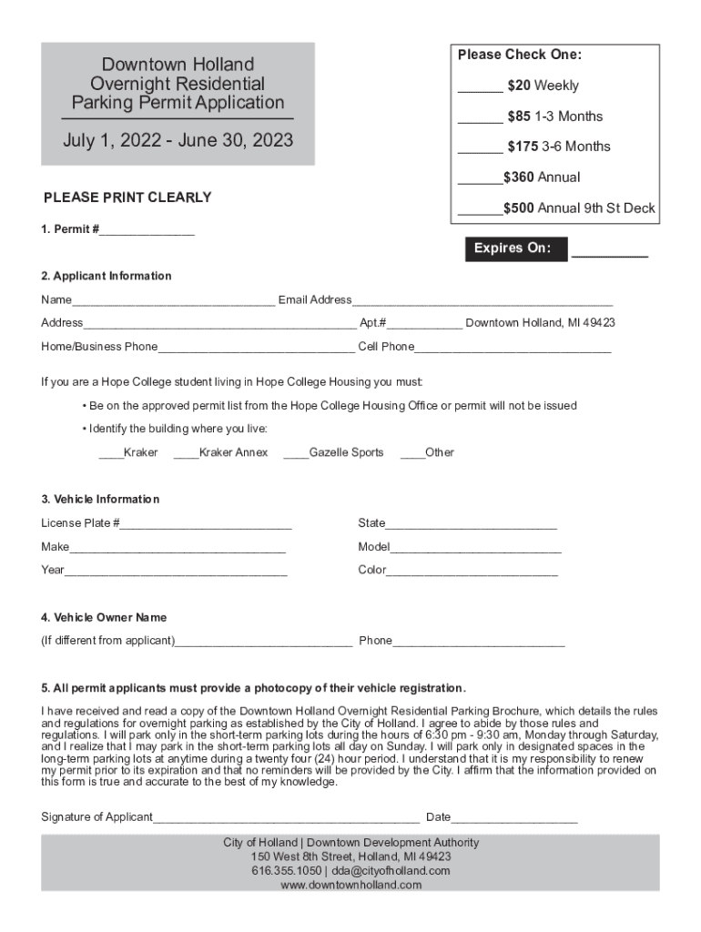 Please Check One:Downtown Holland Overnight Residential Parking Permit Application___ $20 Weekly ___ $85 13 Months July 1, 2022, June 30, 2023___ $175 36 Months ___$360 AnnualPLEASE PRINT CLEARLY___$500