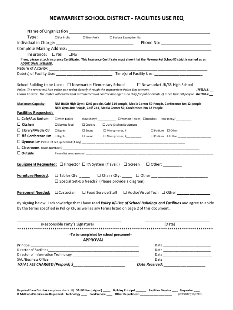 NEWMARKET SCHOOL DISTRICT FACILITIES USE REQ Name of Organization ___ Type: For Profit Nonprofit Federal Exemption No. ___ Individual in Charge: ___ Phone No: ___ Complete Mailing Address: ___ Insurance: