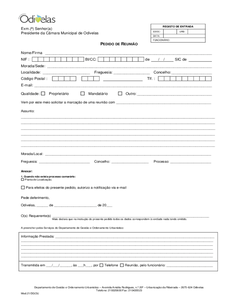 REGISTER DE ENTRADAExm.() Senior(a) President the Clara Municipal de OdivelasEDOC:URB:DATA: FUNCIONRIO:PEDRO DE REUNION Nome/Firm ___ NIF :BI/CC:DE//SIC Demerara/See: ___ Localized: ___Freesia: ___