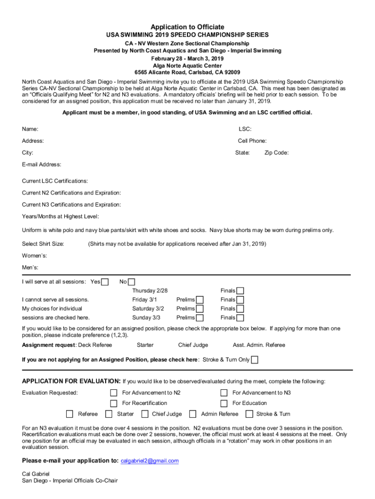 Application to Officiate USA SWIMMING 2019 SPEED CHAMPIONSHIP SERIES CA NV Western Zone Sectional Championship Presented by North Coast Aquatics and San Diego Imperial Swimming February 28 March 3,