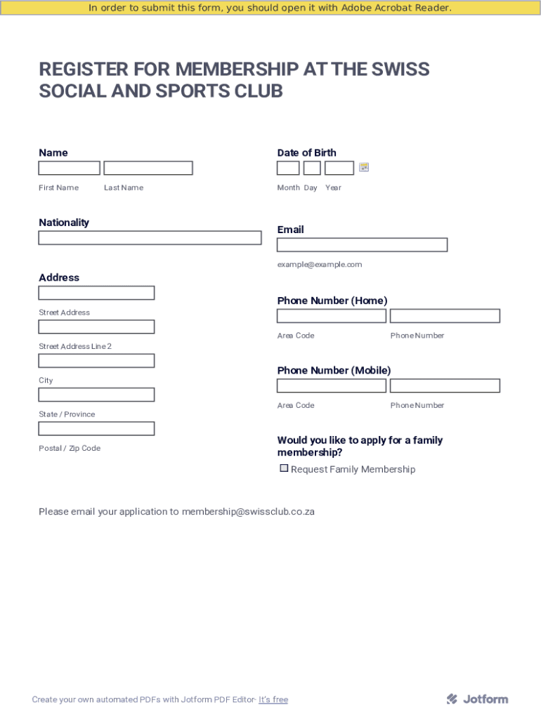 In order to submit this form, you should open it with Adobe Acrobat Reader. REGISTER FOR MEMBERSHIP AT THE SWISS SOCIAL AND SPORTS CLUB Name First Name Date of Birth Last NameNationalityMonth DayYearEmail