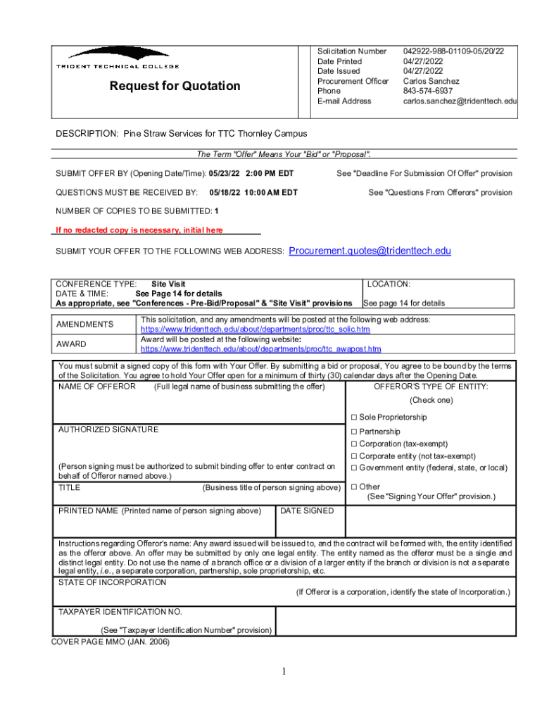 Solicitation Number Date Printed Date Issued Procurement Officer Phone Email AddressRequest for Quotation0429229880110905/20/22 04/27/2022 04/27/2022 Carlos Sanchez 8435746937 carlos.sanchez@tridenttech.eduDESCRIPTION: