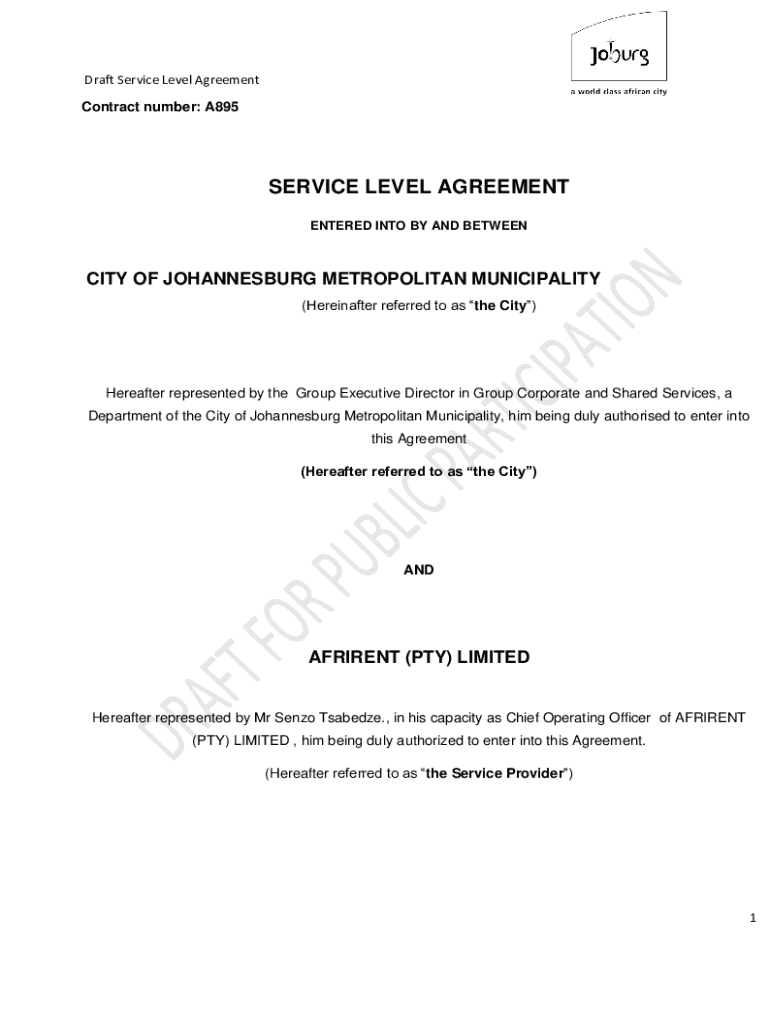 Draft Service Level Agreement Contract number: A895SERVICE LEVEL AGREEMENT ENTERED INTO BY AND BETWEENCITY OF JOHANNESBURG METROPOLITAN MUNICIPALITY (Hereinafter referred to as the City)Hereafter