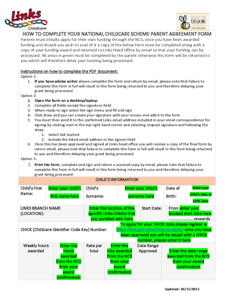 HOW TO COMPLETE YOUR NATIONAL CHILDCARE SCHEME PARENT AGREEMENT FORM Parents must initially apply for their own funding through the NCS, once you have been awarded funding and should you wish to avail