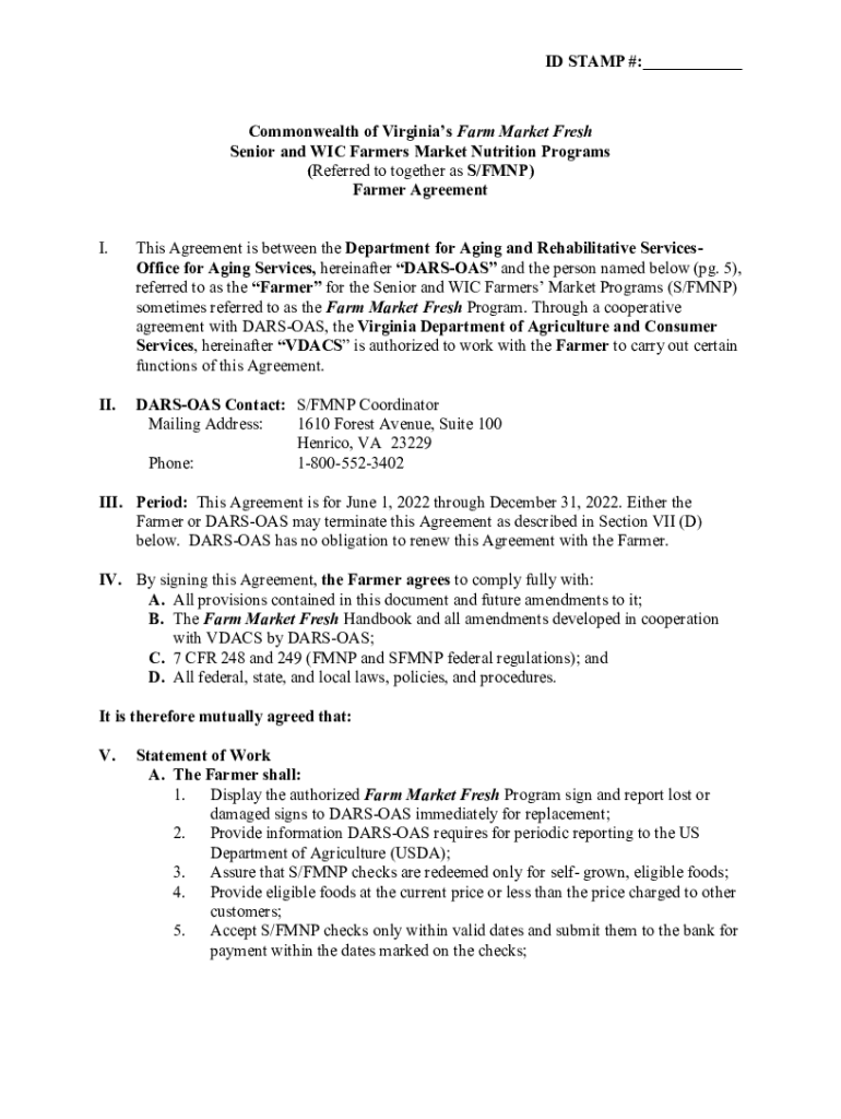ID STAMP #:___Commonwealth of Virginia's Farm Market Fresh Senior and WIC Farmers Market Nutrition Programs (Referred to together as S/MNP) Farmer Agreement I. This Agreement is between the Department
