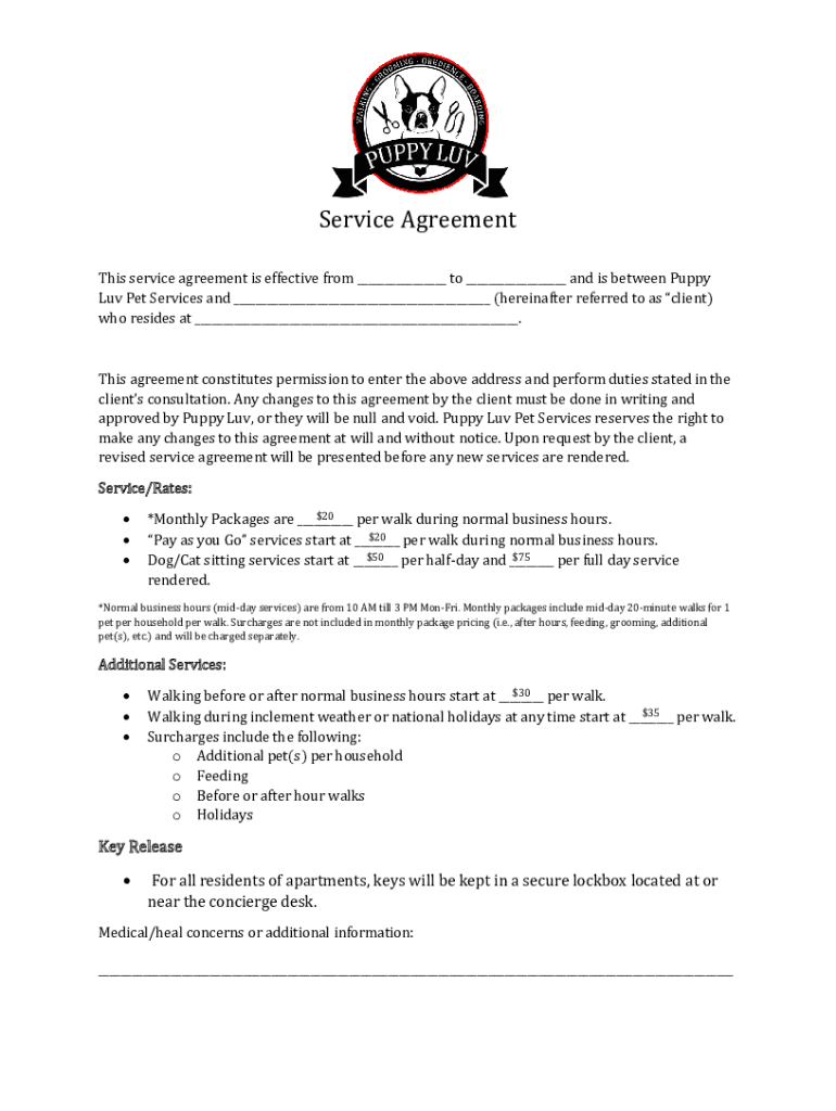 Service Agreement This service agreement is effective from ___ to ___ and is between Puppy Love Pet Services and ___ (hereinafter referred to as client) who resides at ___. This agreement constitutes