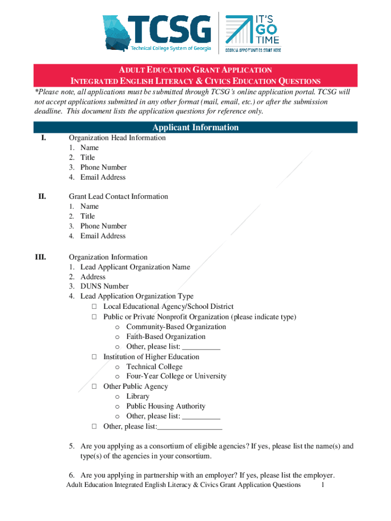 ADULT EDUCATION GRANT APPLICATION INTEGRATED ENGLISH LITERACY & CIVICS EDUCATION QUESTIONS *Please note, all applications must be submitted through Tests online application portal. CSG will not accept