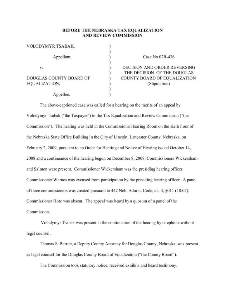 BEFORE THE NEBRASKA TAX EQUALIZATION AND REVIEW COMMISSION VOLODYMYR TEABAG, Appellant, v. DOUGLAS COUNTY BOARD OF EQUALIZATION, Appealed.) )))))))))Case No 07R436 DECISION AND ORDER REVERSING THE