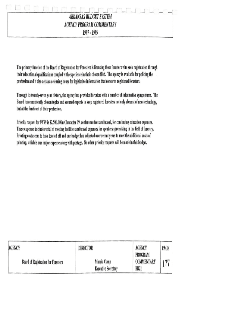 .r___r ___ _.;___;___;___...1__! I._, Arkansas BUDGET SYSTEM AGENCY PROGRAM COMMENTARY19971999The primary function of the Board of Registration for Foresters is licensing those foresters who seek