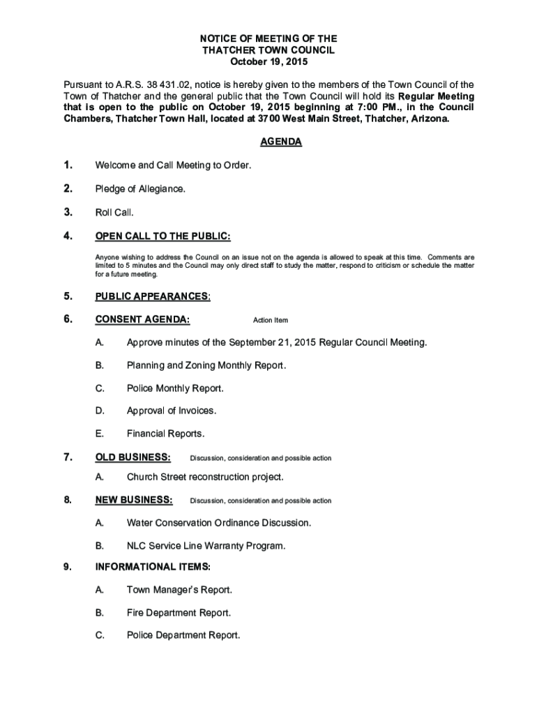 NOTICE OF MEETING OF THE THATCHER TOWN COUNCIL October 19, 2015, Pursuant to A.R.S. 38 431.02, notice is hereby given to the members of the Town Council of the Town of Thatcher and the public that