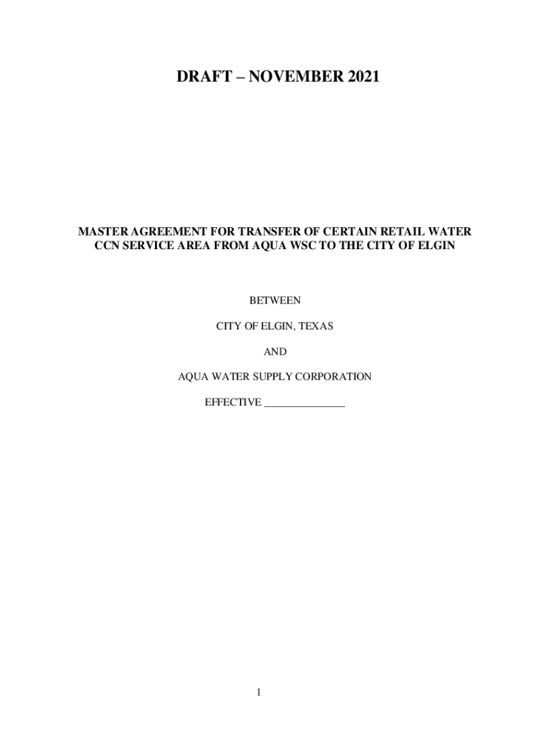 DRAFT NOVEMBER 2021MASTER AGREEMENT FOR TRANSFER OF CERTAIN RETAIL WATER CCN SERVICE AREA FROM AQUA WSC TO THE CITY OF ELGINBETWEEN CITY OF ELGIN, TEXAS AND AQUA WATER SUPPLY CORPORATION EFFECTIVE