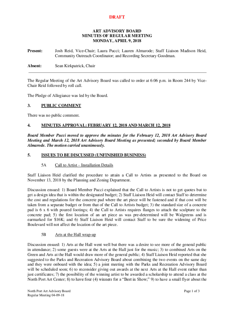 DRAFT ART ADVISORY BOARD MINUTES OF REGULAR MEETING MONDAY, APRIL 9, 2018, Present:Josh Reid, Timeshare; Laura Gucci; Lauren Alma rode; Staff Liaison Madison Had, Community Outreach Coordinator; and