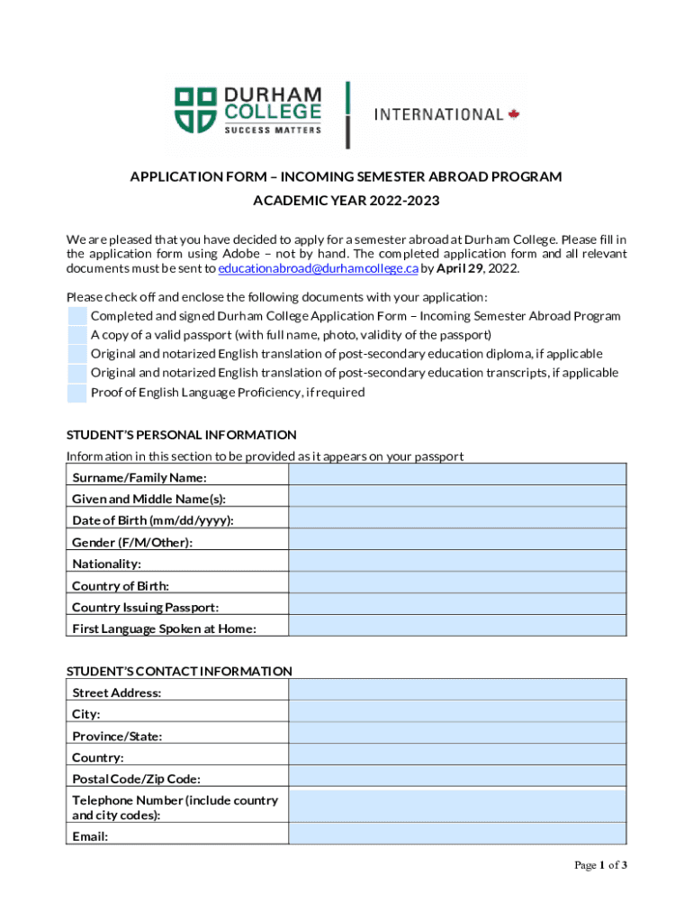APPLICATION FORM INCOMING SEMESTER ABROAD PROGRAM ACADEMIC YEAR 20222023 We are pleased that you have decided to apply for a semester abroad at Durham College. Please fill in the application form