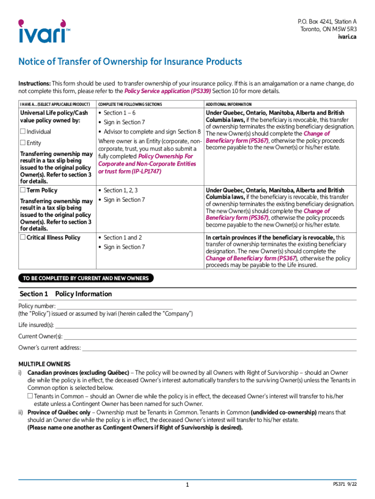 P.O. Box 4241, Station A Toronto, ON M5W 5R3 vary. Notice of Transfer of Ownership for Insurance Products Instructions: This form should be used to transfer ownership of your insurance policy. If