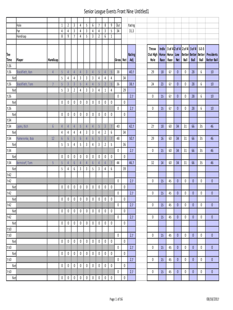 Senior League Events Front Nine Untitled1 Hole Par Handicapped Time 7:26 7:26Player Stockfleth, Ron1 4 82 4 93 3 74 4 45 3 56 4 37 4 28 3 69 5 14Net5 5 5 54 4 3 34 4 3 24 3 5 43 3 4 34 3 4 35 4 5