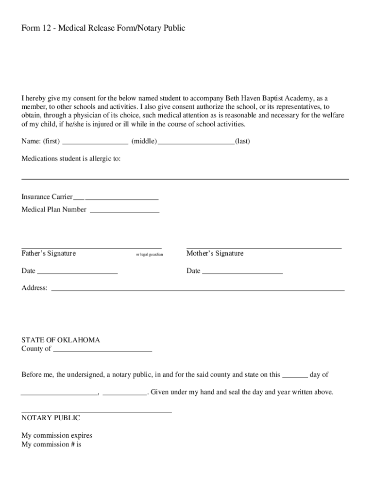 Get the free Form 12 - Medical Release Form/Notary Public - okcbaptistchurch.com