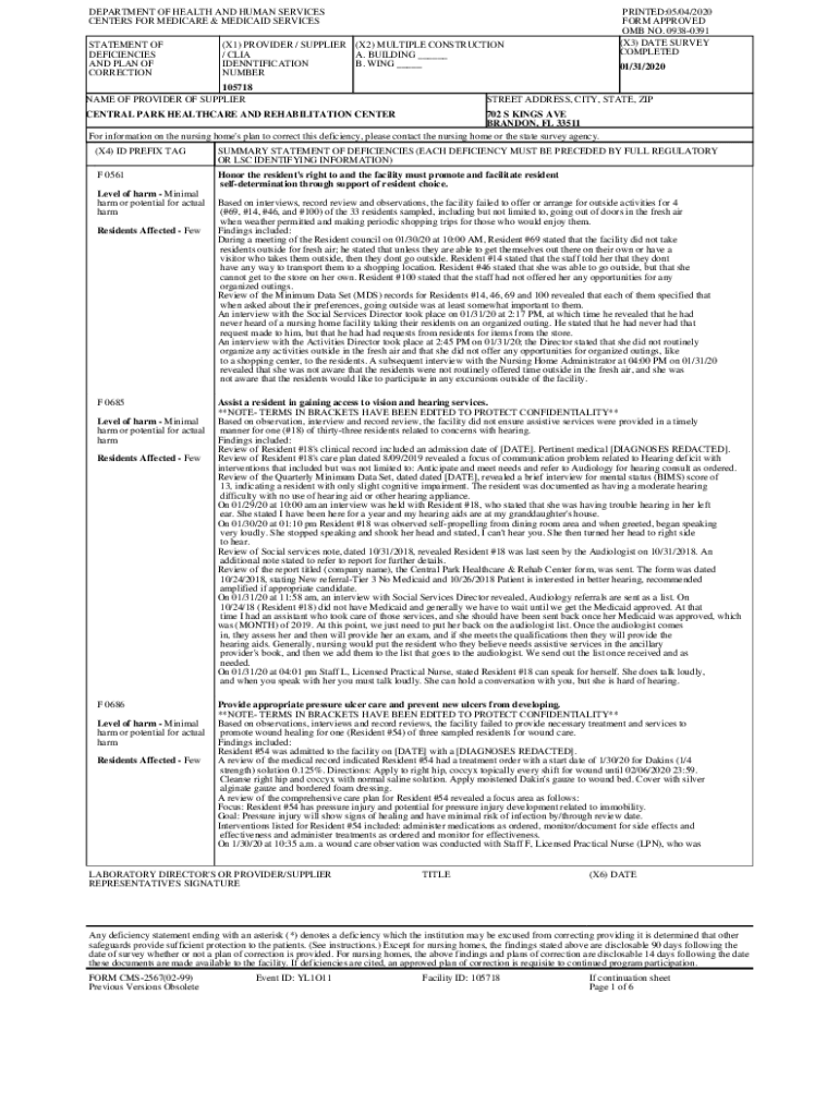 Get the free Nursing Home Survey Report Details for CENTRAL PARK HEALTHCARE AND REHABILITATION CE...