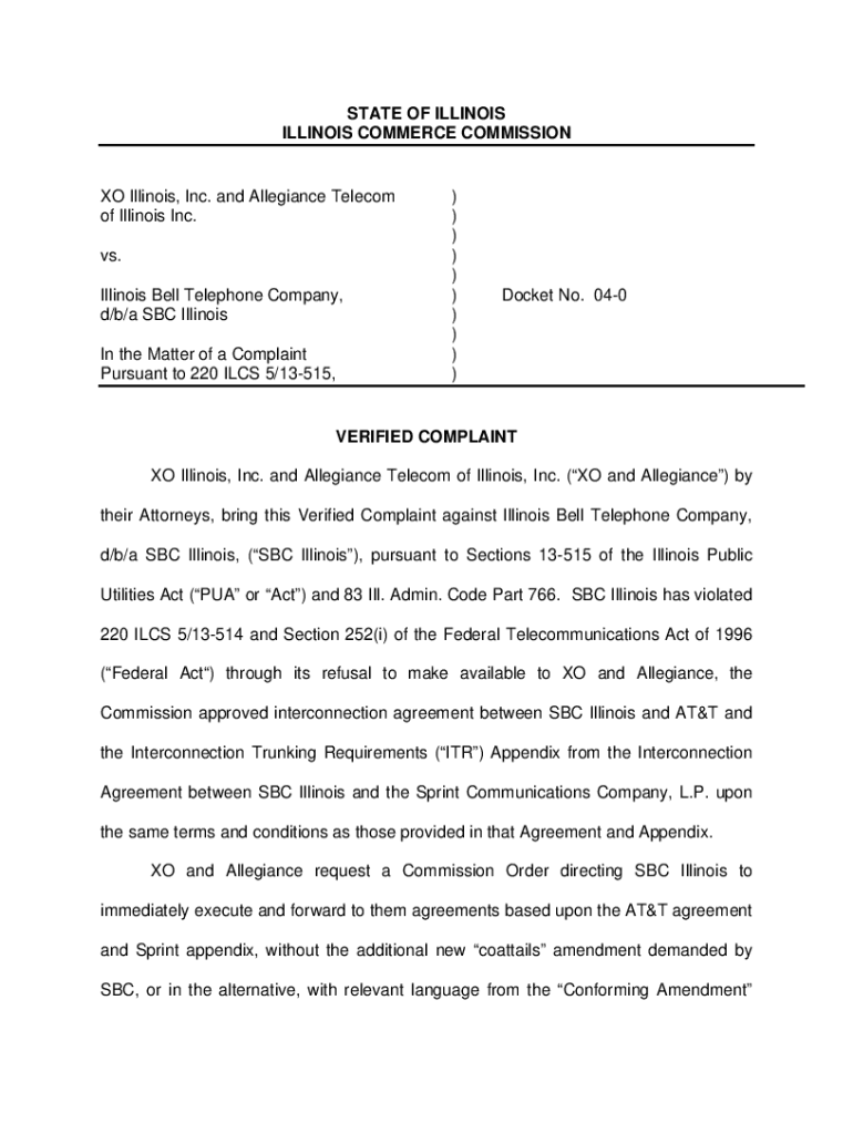 STATE OF ILLINOIS COMMERCE COMMISSION Illinois, Inc. and Allegiance Telecom of Illinois Inc. vs. Illinois Bell Telephone Company, d/b/an SBC Illinois In the Matter of a Complaint Pursuant to 220 ILLS