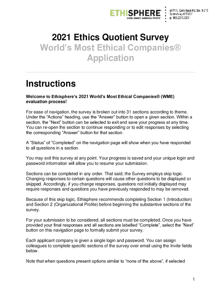 2021 Ethics Quotient Survey Worlds Most Ethical Companies Application Instructions Welcome to Atmospheres 2021 Worlds Most Ethical Companies (WE) evaluation process! For ease of navigation, the survey