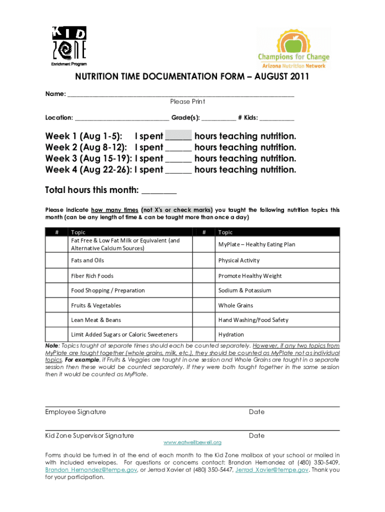 Enrichment ProgramNUTRITION TIME DOCUMENTATION FORM AUGUST 2011 Name: ___ Please Print Location: ___ Grade(s): ___ # Kids: ___Week 1 (Aug 15): I spent ___ hours teaching nutrition. Week 2 (Aug 812):
