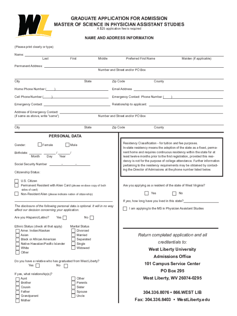 GRADUATE APPLICATION FOR ADMISSION MASTER OF SCIENCE IN PHYSICIAN ASSISTANT STUDIES A $25 application fee is requiredNAME AND ADDRESS INFORMATION (Please print clearly or type) Name:LastFirstPermanent