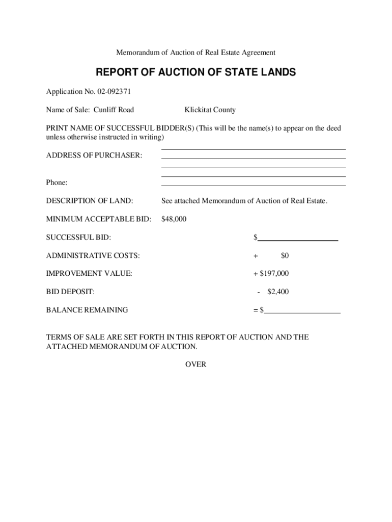 Memorandum of Auction of Real Estate AgreementREPORT OF AUCTION OF STATE LANDS Application No. 02092371 Name of Sale: Cliff RoadKlickitat Counterpoint NAME OF SUCCESSFUL BIDDER(S) (This will be the