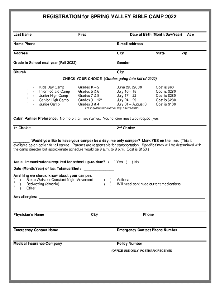REGISTRATION for SPRING VALLEY BIBLE CAMP 2022Last NameFirstDate of Birth (Month/Day/Year)Home Phonemic addressAddressCityGrade in School next year (Fall 2022)GenderChurchCityStateAgeZipCHECK YOUR