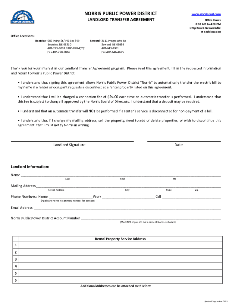 NORRISPUBLICPOWERDISTRICTwww. Norris.comLANDLORDTRANSFERAGREEMENT