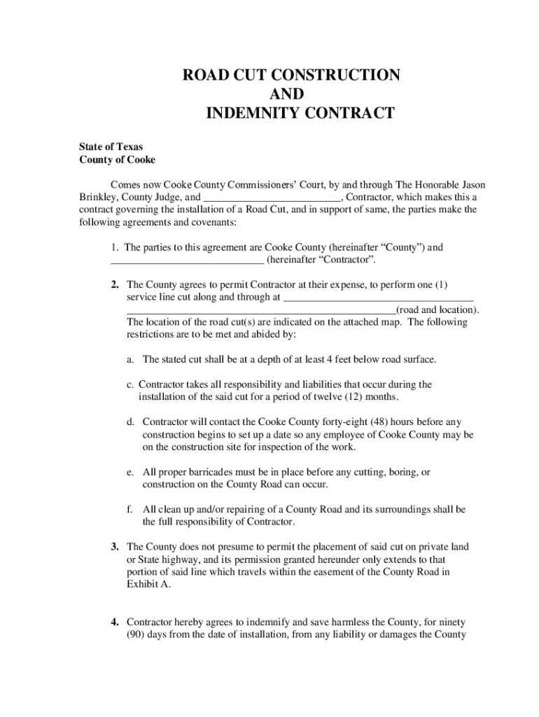 ROAD CUT CONSTRUCTION AND INDEMNITY CONTRACT State of Texas County of Cooke Comes now Cooke County Commissioners Court, by and through The Honorable Jason Brinkley, County Judge, and ___, Contractor,