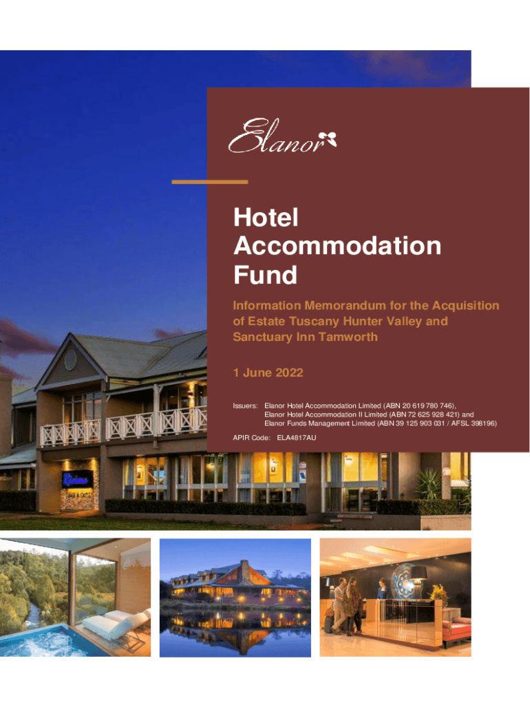 Hotel Accommodation Fund Information Memorandum for the Acquisition of Estate Tuscany Hunter Valley and Sanctuary Inn Tamworth 1 June 2022 Issuers: Elanor Hotel Accommodation Limited (ABN 20 619 780