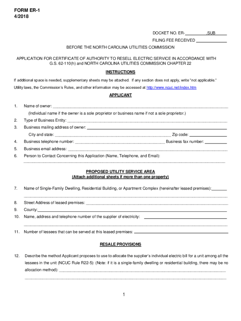 FORM ER1 4/2018DOCKET NO. ER, SUBSIDING FEE RECEIVED BEFORE THE NORTH CAROLINA UTILITIES COMMISSION APPLICATION FOR CERTIFICATE OF AUTHORITY TO RESELL ELECTRIC SERVICE IN ACCORDANCE WITH G.S. 62110(h)