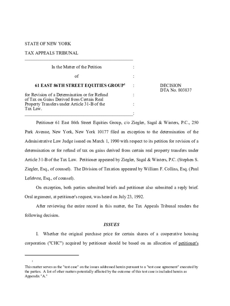 STATE OF NEW YORK TAX APPEALS TRIBUNAL ___ In the Matter of the Petition:of:61 EAST 86TH STREET EQUITIES GROUP1:for Revision of a Determination or for Refund : of Tax on Gains Derived from Certain