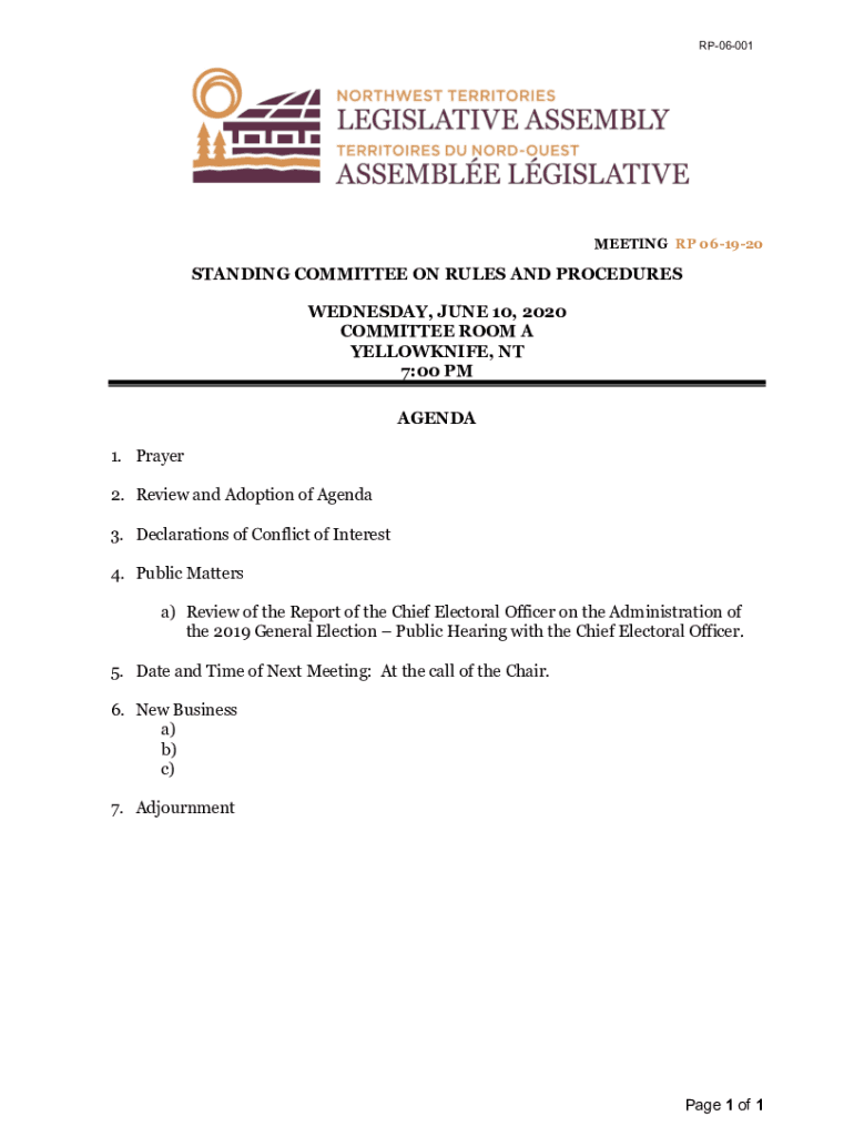 RP06001MEETING RP 061920STANDING COMMITTEE ON RULES AND PROCEDURES WEDNESDAY, JUNE 10, 2020, COMMITTEE ROOM A YELLOWKNIFE, NT 7:00 PM AGENDA 1. Prayer 2. Review and Adoption of Agenda 3. Declarations