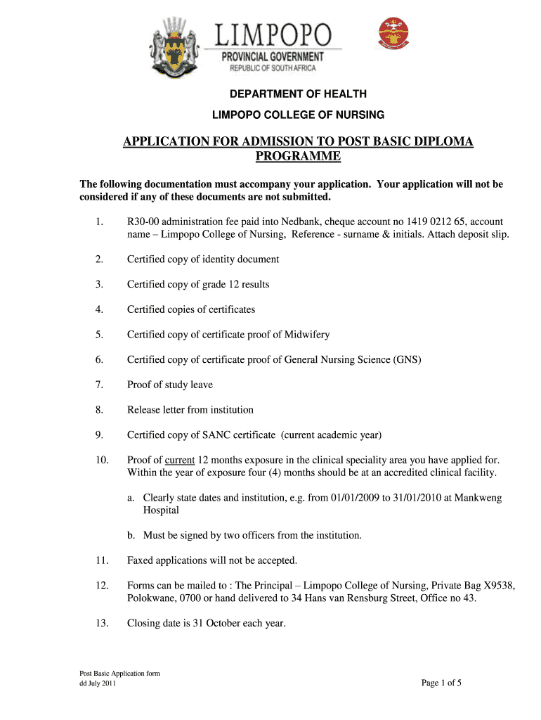 DEPARTMENT OF HEALTH LIMPOPO COLLEGE OF NURSING APPLICATION FOR ADMISSION TO POST BASIC DIPLOMA Program The following documentation must accompany your application. Your application will not be considered