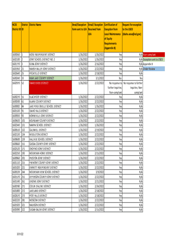 Get the free NCES District ID District ID District Name Email/Exception Form sent ...