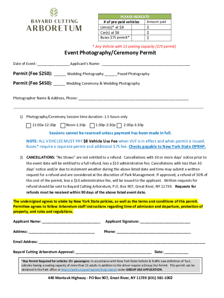 PLEASE INDICATE Amount paid # of prepaid vehicles Limo(s)* at $$8 Car(s) at $$8 Buses $75 permit* $ * Any Vehicle with 15 seating capacity ($75 permit)Event Photography/Ceremony Permitted of Event: