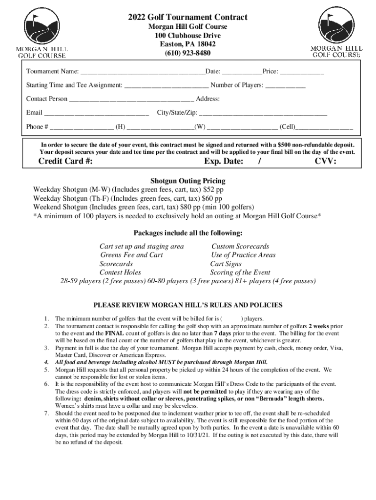 2022 Golf Tournament Contract Morgan Hill Golf Course 100 Clubhouse Drive Easton, PA 18042 (610) 9238480 Tournament Name: ___Date: ___Price: ___ Starting Time and Tee Assignment: ___ Number of Players: