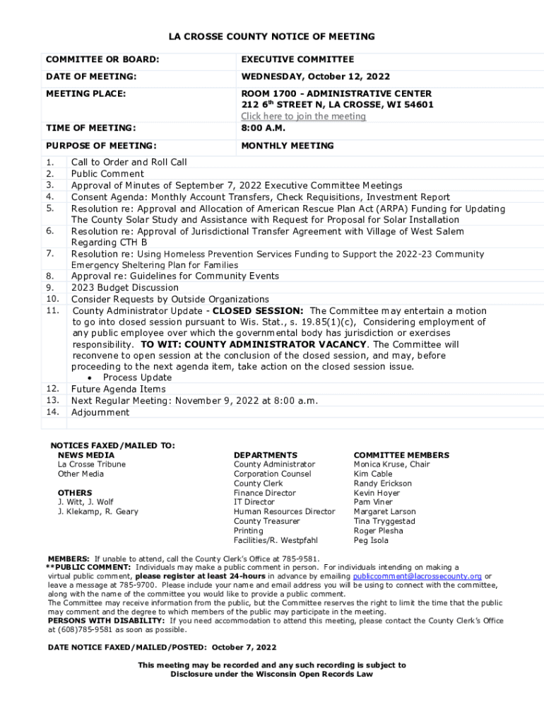 LA CROSSE COUNTY NOTICE OF MEETING COMMITTEE OR BOARD:EXECUTIVE COMMITTEEMAN OF MEETING:WEDNESDAY, October 12, 2022MEETING PLACE:ROOM 1700 ADMINISTRATIVE CENTER 212 6th STREET N, LA CROSSE, WI 54601Click