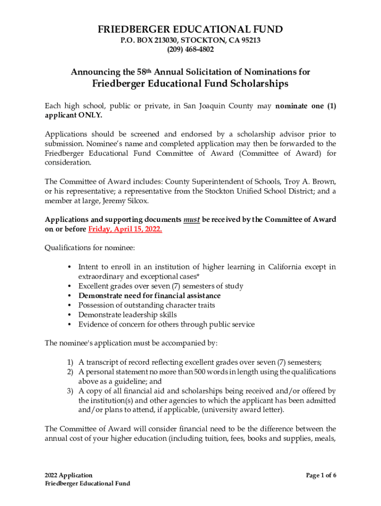 (209) 4684802Announcing the 58th Annual Solicitation of Nominations forFriedberger Educational Fund Scholarships