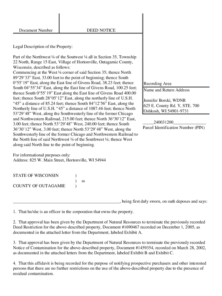 Document Numbered NOTICELegal Description of the Property: Part of the Northwest of the Southwest all in Section 35, Township 22 North, Range 15 East, Village of Porterville, Outage County, Wisconsin,